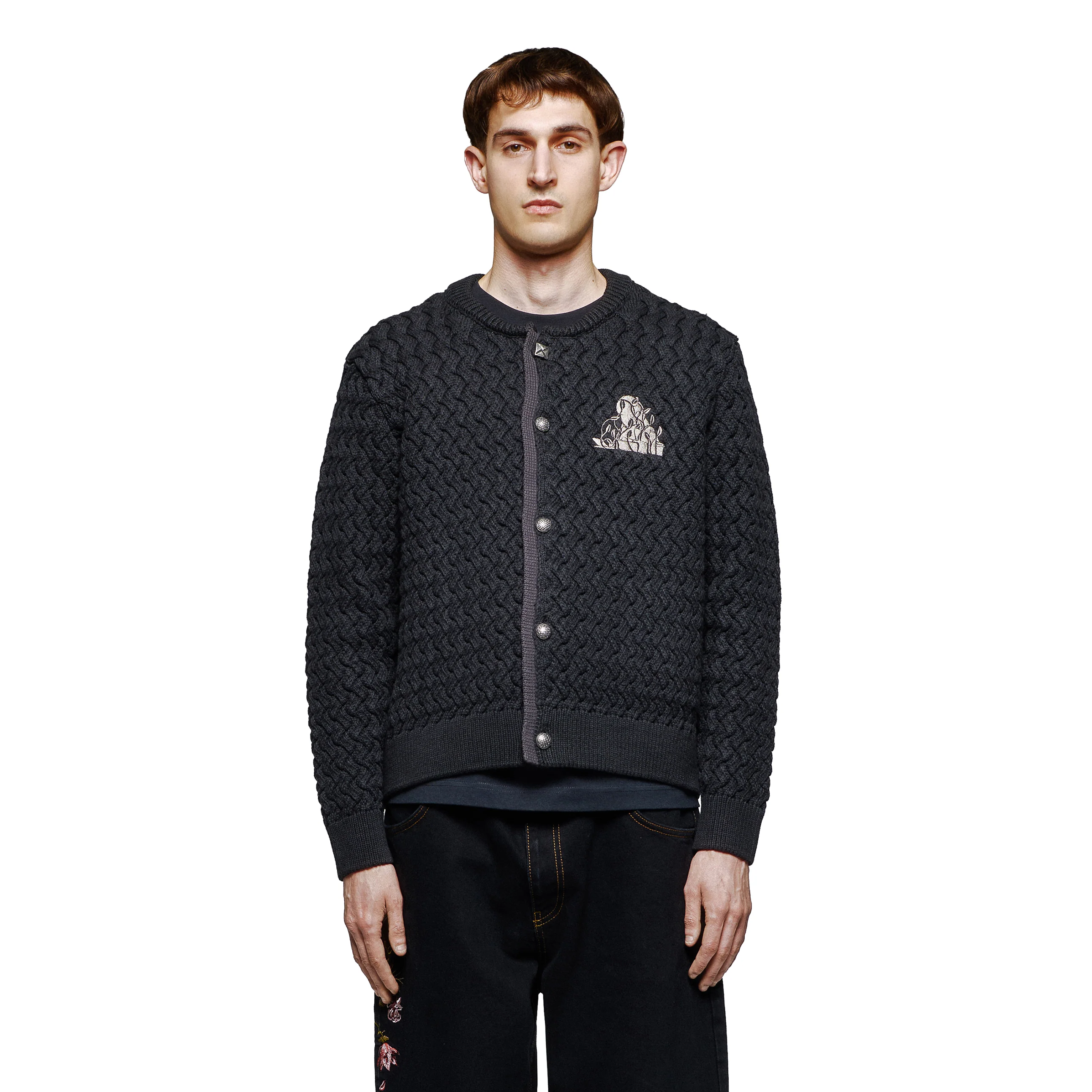 100% cotton / basket weave knit / embroidery on front and back / custom buttons / fits true to size