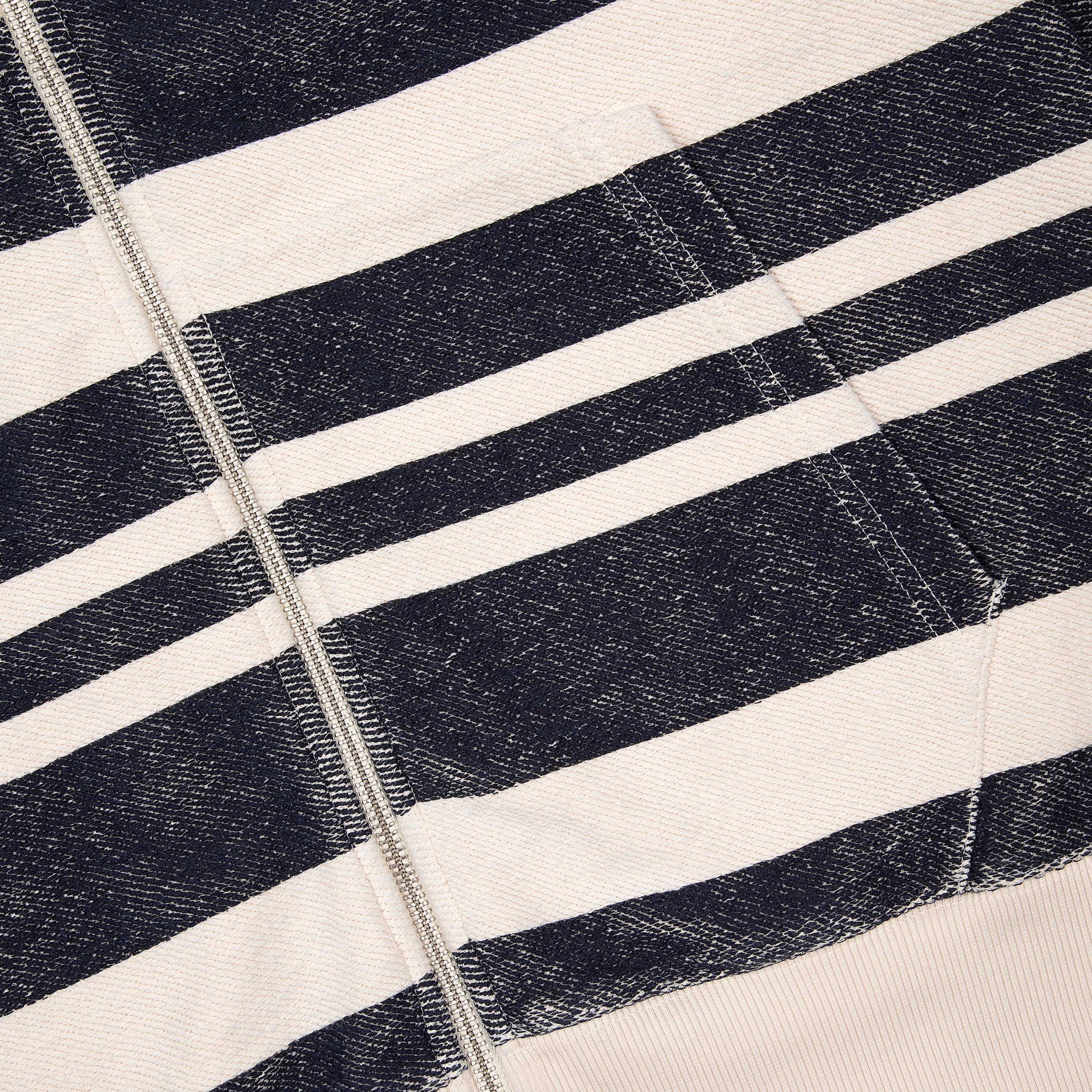 460gsm / 100% preshrunk cotton / reversed side of fabric used intentionally / printed stripes (wash and iron inside out at low heat) / embroidery on front / with double-slided YKK zipper / fits true to size