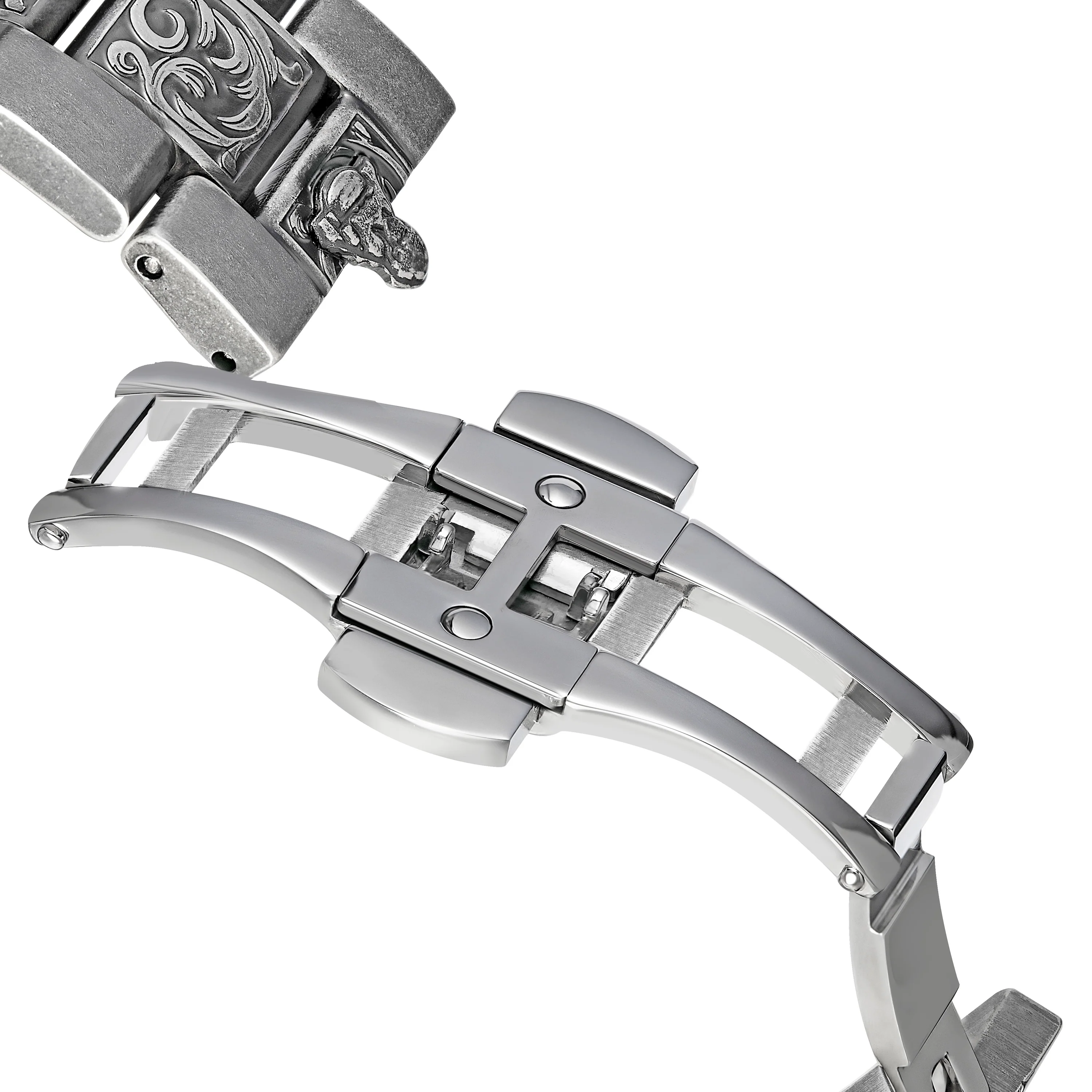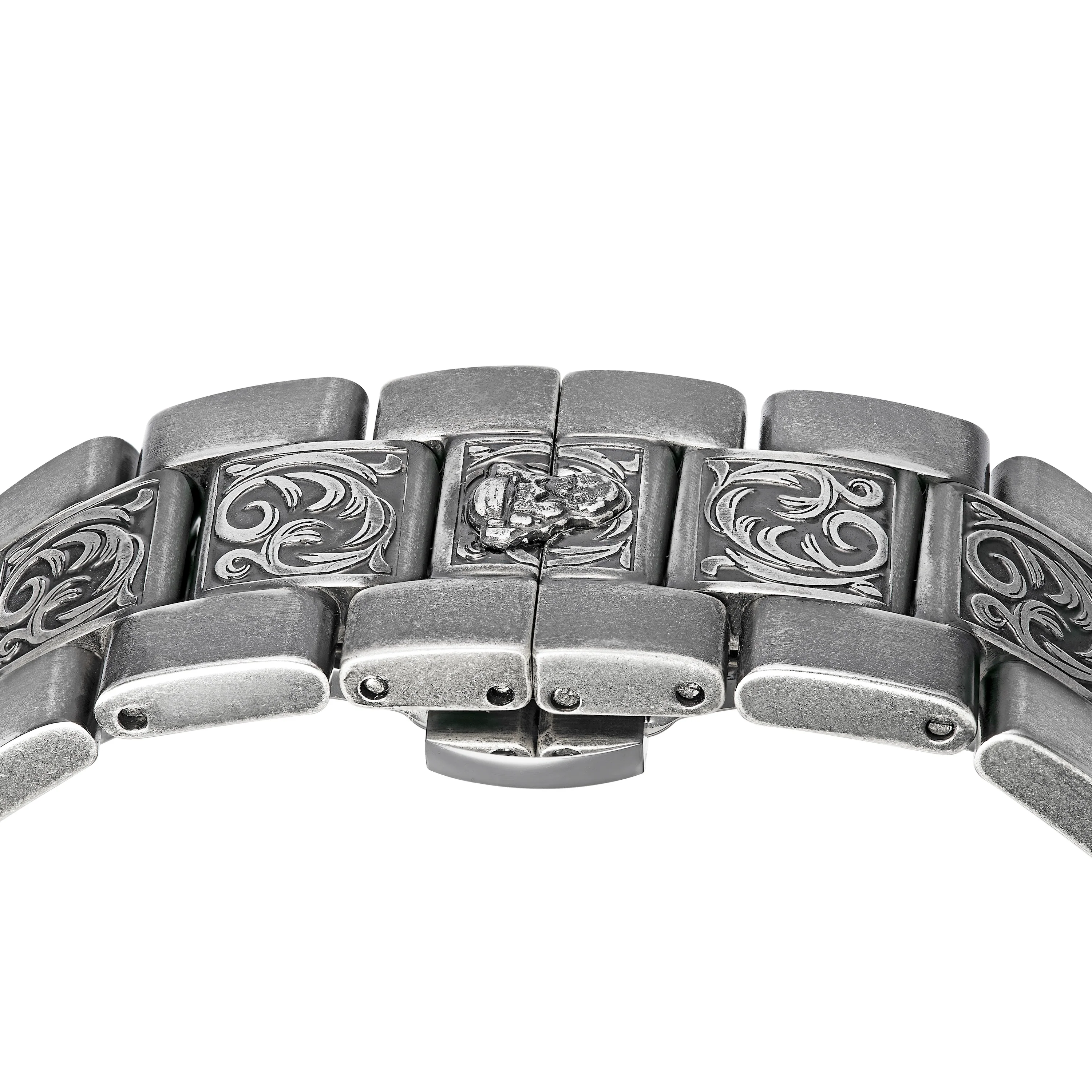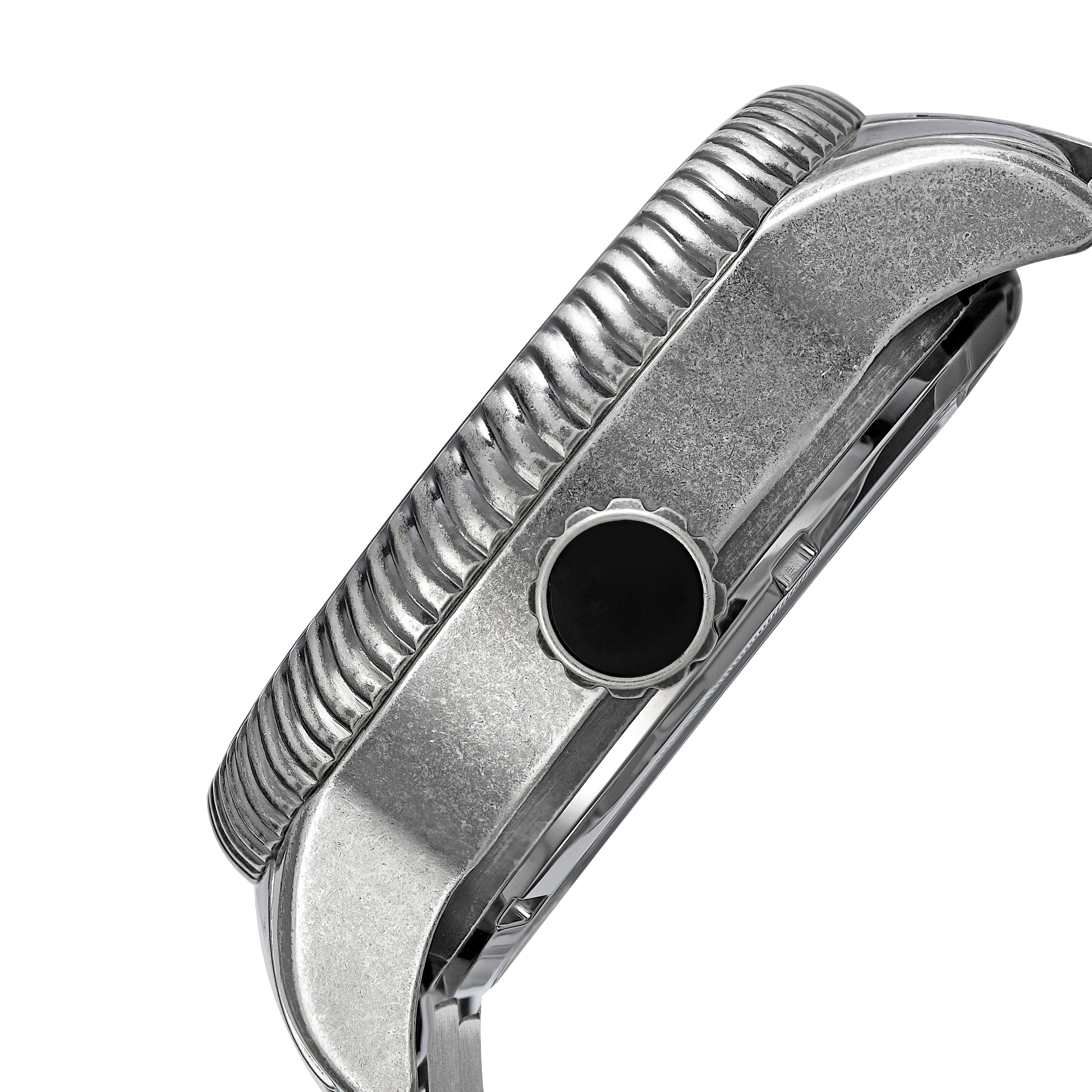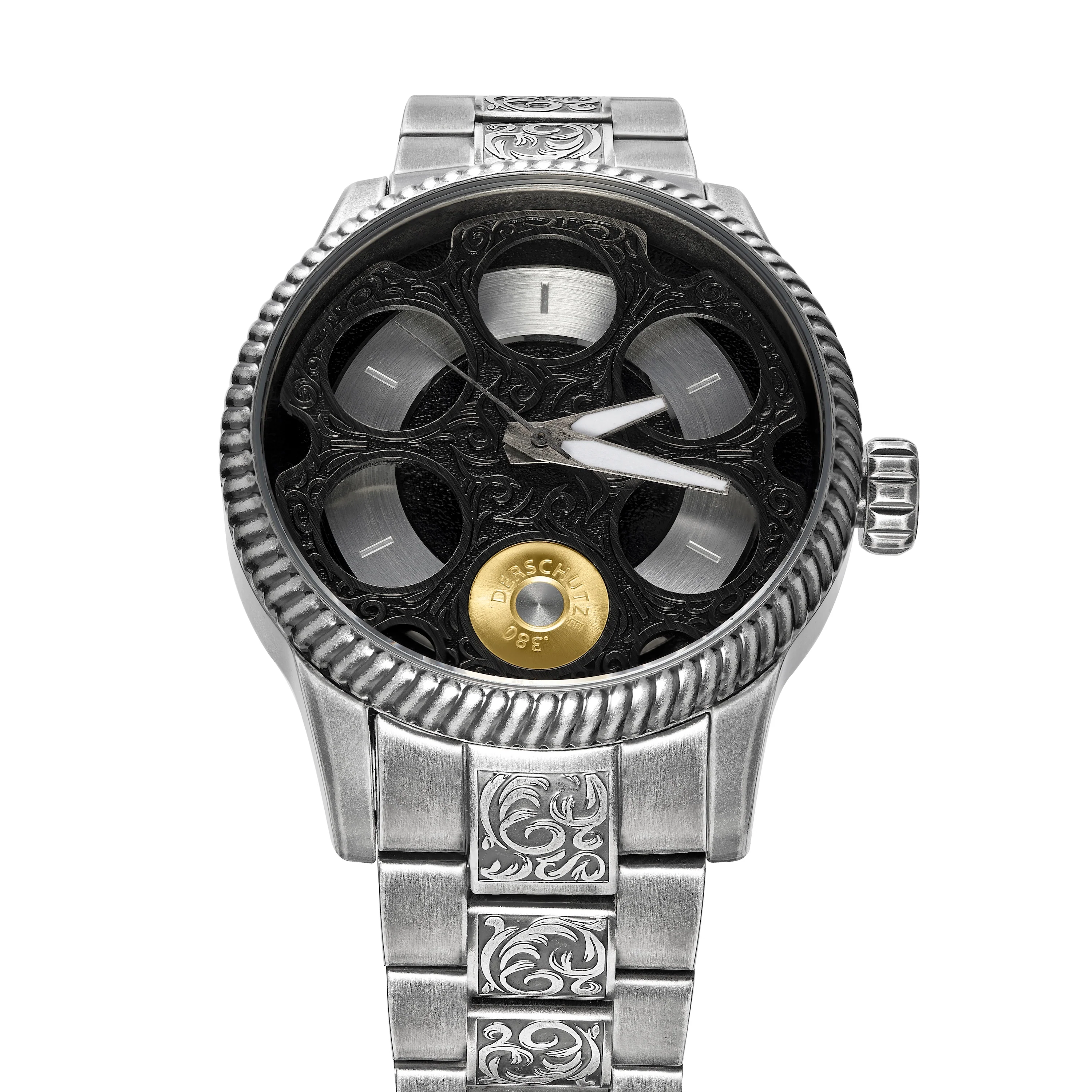 solid stainless steel with a brushed gunmetal finish and engraved pattern on bracelet and dial / JAPANESE MIYOTA 8215 automatic movement / rotating unique revolver cylinder motif with 6 chambers and a golden bullet-style detail / luminous effect / up to 10 ATM (waterproof) / approx. 43mm